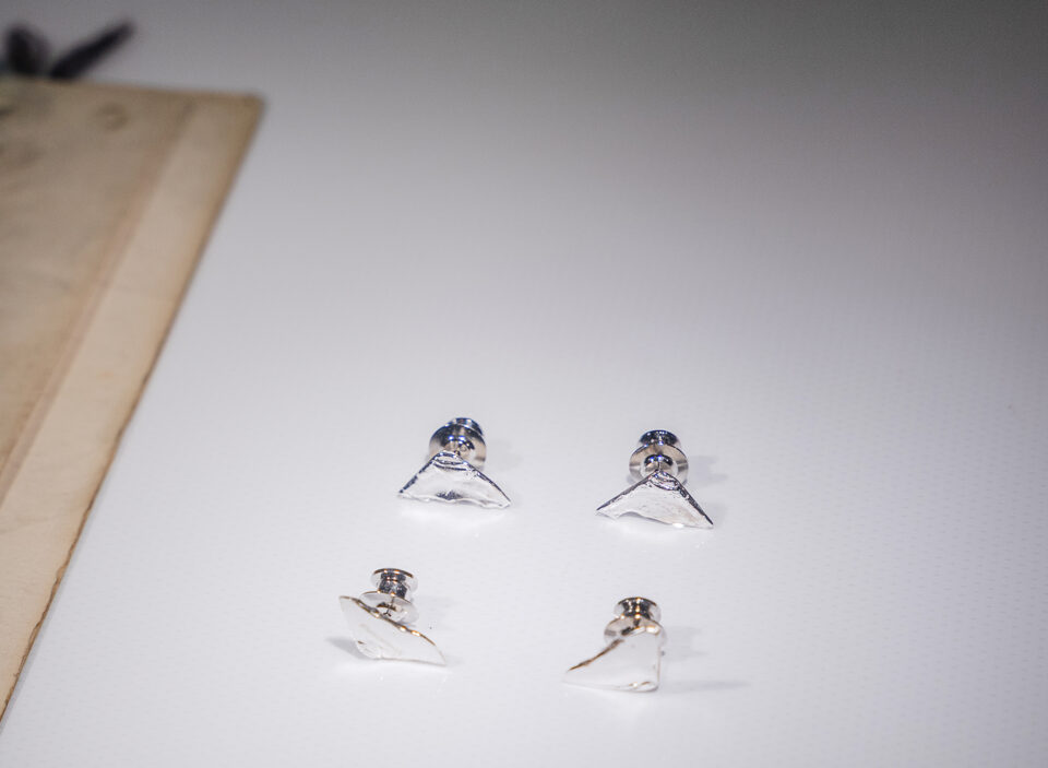 70年間もこんなに綺麗に糸見本が残っているのはそれほど大切にされてきたという事、この時間軸や歴史に対するの敬意が色見本の台紙の四隅のシワに現れていたので、そのまま3Dスキャンニングや粘土のような型取り用の特殊な材料を駆使し、そのままシワをシルバーブローチとして仕立てさせていただきました。