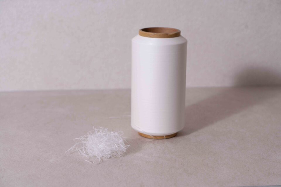 原料だけでなく、PAPIERの製造工程にも秘訣がある。一般的な和紙糸は、和紙を細長くスリットした後に他の糸との撚糸工程に入ることがほとんどだ。しかし、PAPIERは和紙のスリットとリサイクルポリエステルとの撚糸工程を一貫で生産する特許装置により製造される。