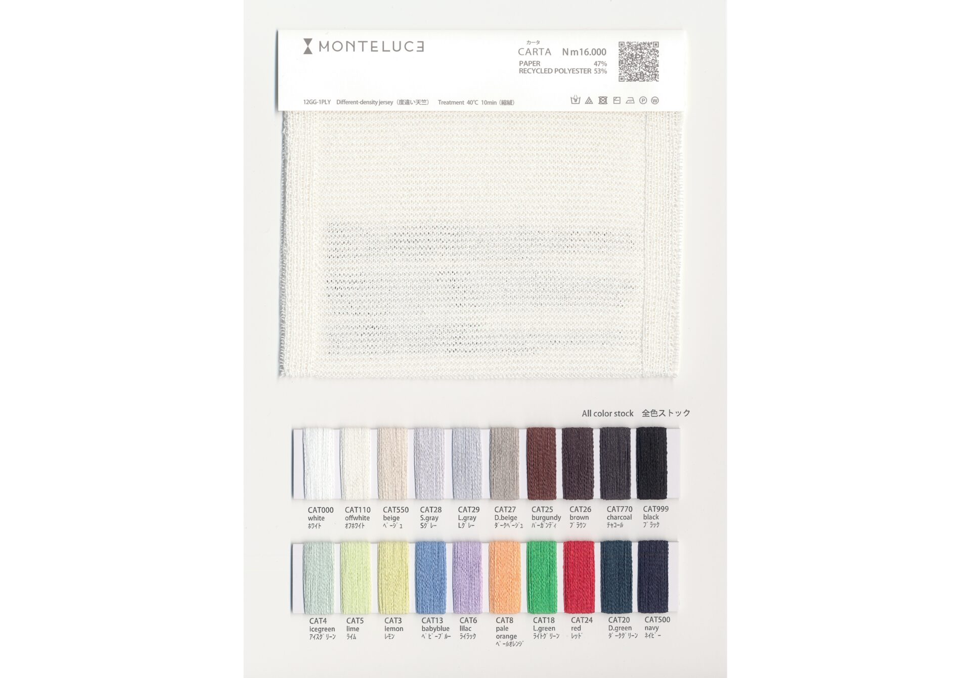 CARTAは、紙のスリットから撚糸までを一貫工程で生産できる特殊機械で行う事により、従来果たせなかった安定した品質・生産性を維持できるようになりました。また糸の芯部分に極細のポリエステルを起用することと、独自の撚糸方法で紙部分に撚りがほぼ入らず、糸の周りをほぼ紙で覆われているため、従来の紙糸にない伸度、ソフトな風合い、イージケア性に優れる事が特徴です。